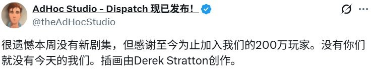 官方表示:“虽然我们也因本周没有新剧集感到遗憾,但更要感谢已加入我们的200万玩家——没有你们就没有我们。"