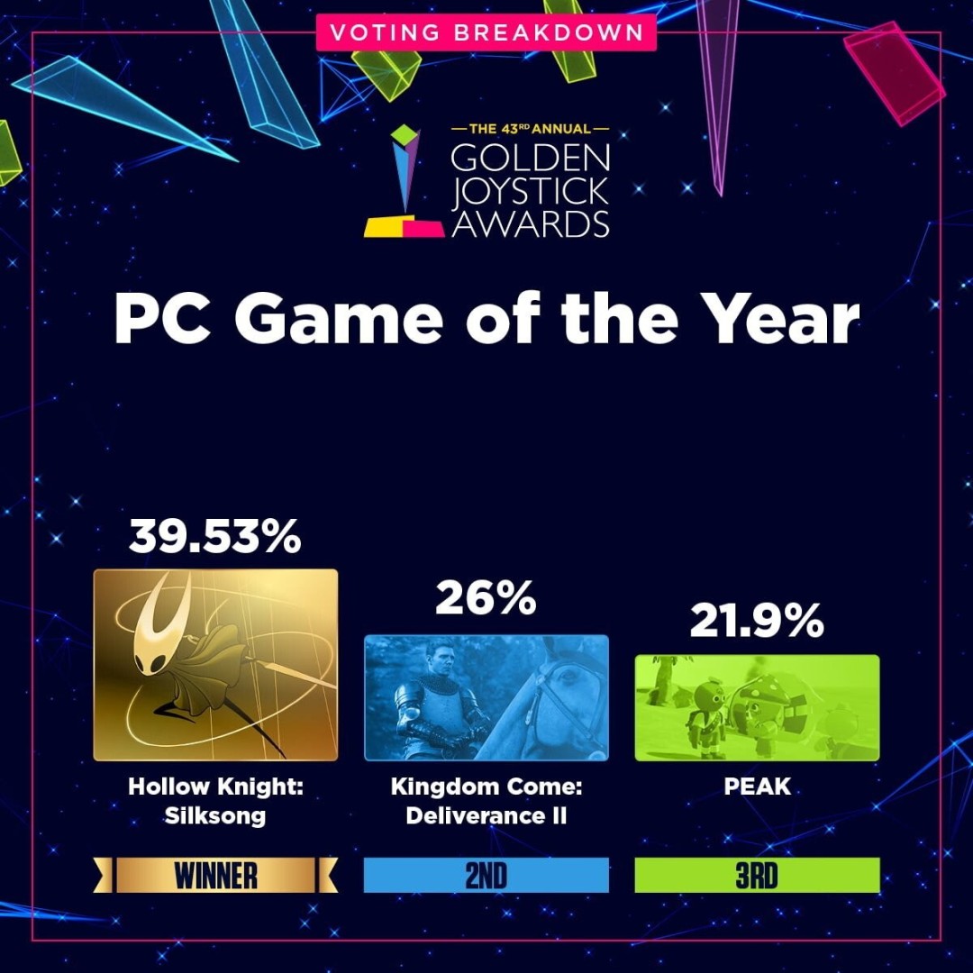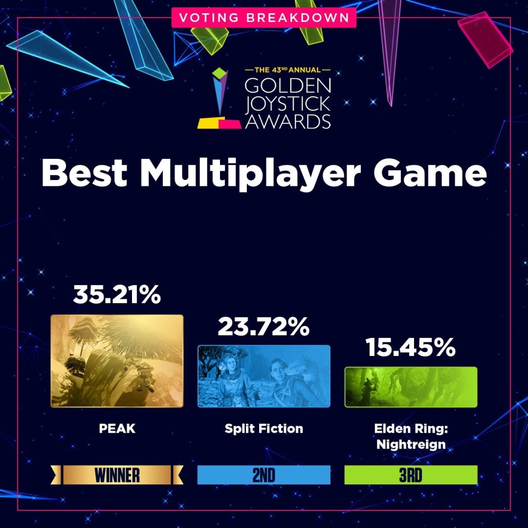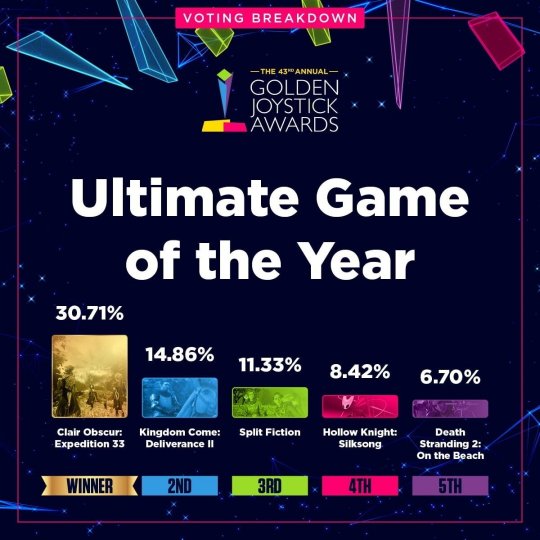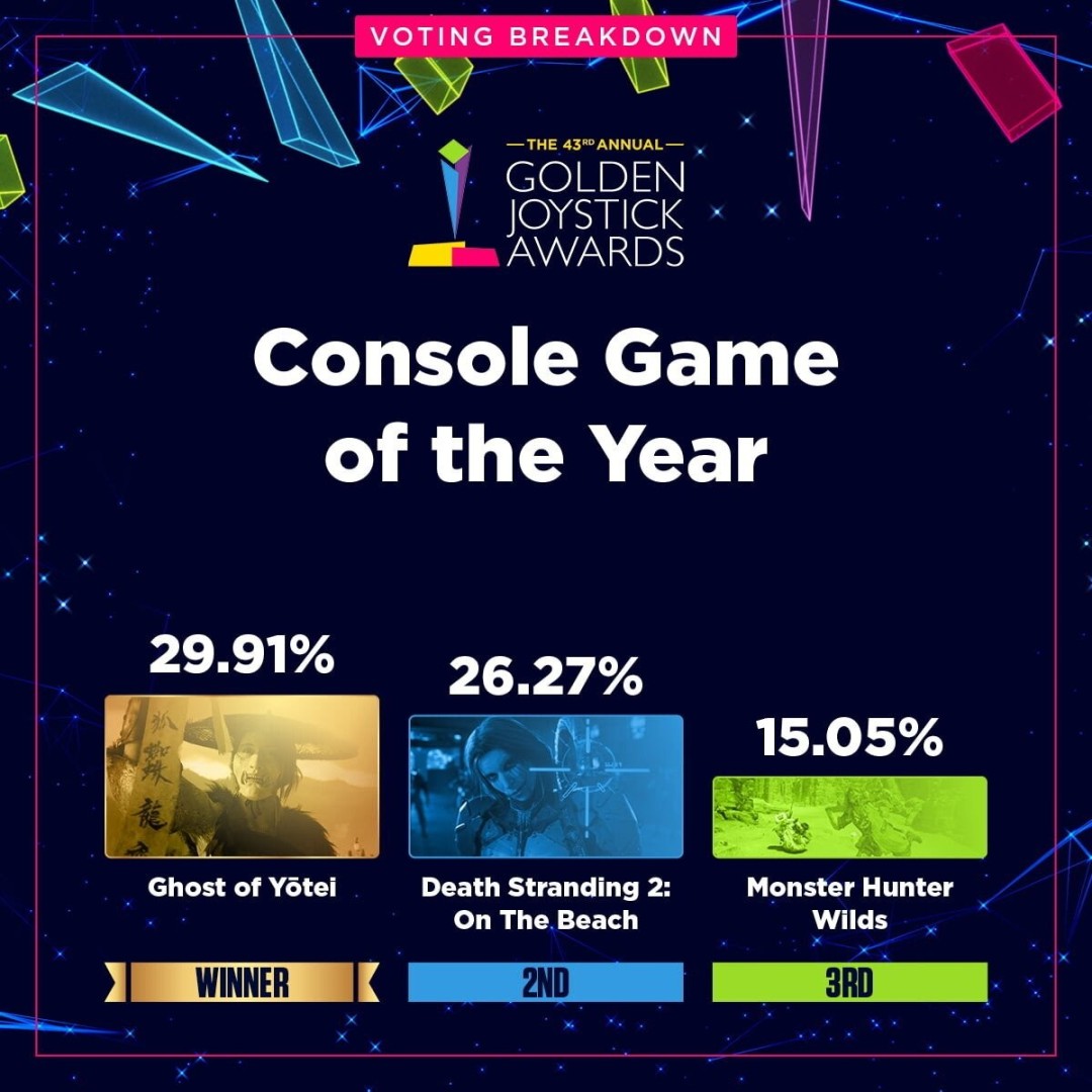 数据显示,部分获奖作品以绝对优势胜出,而另一些奖项的角逐则持续到最后一刻。最受热议的结果之一来自“最受期待游戏”类别——《GTA6》与《巫师4》的得票率仅相差不到2%,分别为18.03%和16.68%。据主办方透露,由于某个阶段两款游戏的票数曾急剧接近,团队甚至已开始为可能出现反转结局做准备。