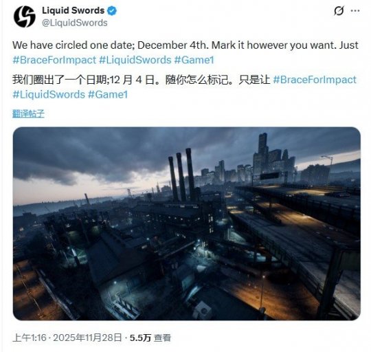 由业界资深人士、《正当防卫》系列导演及雪崩工作室(Avalanche Studios)联合创始人克里斯托弗·桑德伯格创立的Liquid Swords游戏工作室,近日通过其官方社交媒体账号发布了一则极具分量的预告帖子,宣布将于12月4日揭晓其首款游戏作品。