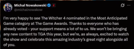 而正当大家都在讨论之时,CDPR官方突然泼了一盆冷水:“咱们没空搞秀,忙着敲代码!”说白了,今年的 TGA将不会有《巫师4》任何新内容公布。但话又说回来,《巫师4》明明拿了“最受期待游戏”提名,却一点消息都不放出来有点说不过去。