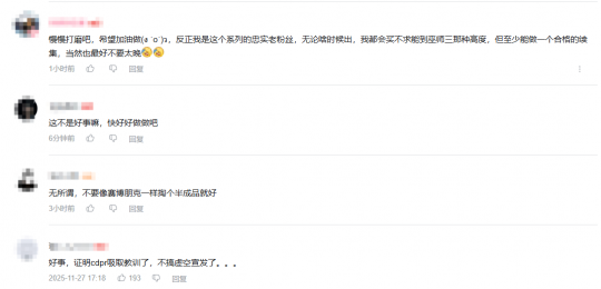 对此,有专家分析CDPR这波操作是吸取《赛博朋克2077》的教训,当时游戏还没做好就推出来,结果被全网喷成筛子,这次CDPR学乖了,不再贸然就官宣未完成之作。而网友也表示理解与支持:“这不是好事嘛,快好好做做吧”、“无所谓,不要像赛博朋克一样掏个半成品就好”、“一款好的游戏是值得等待”。