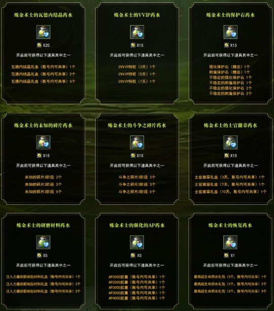 ¡¡¡¡ÔÚ12ÔÂ2ÈÕά»¤ºóÖÁ12ÔÂ16ÈÕά»¤Ç°£¬Ó¢ÐÛÃÇÍê³ÉÌØÊâÕ½ÒÛ¡¢Íõ³Ç»ÆÓñÌüÖÁ·áÈÄÖ®ÉÕ½ÒÛ¡¢ÆïÊ¿ÍÅÕ½ÒÛ¡¢¸ÒËÀ¶ÓÕ½ÒÛ¡¢Ê±¿ÕŤÇúÕ½ÒÛ£¬¼´¿É»ñµÃ“Á¶½ðÊõÊ¿µÄÓ²±Ò”£¬Ê¹ÓÃÓ²±Ò¿ÉÔÚ¶Ò»»É̵ê¶Ò»»µ½Á¶½ðÊõÊ¿µÄÍßµÂÄڽᾧҩˮ¡¢Á¶½ðÊõÊ¿µÄVVIPÒ©Ë®¡¢Á¶½ðÊõÊ¿µÄδ֪µÄËéÆ¬Ò©Ë®µÈ£¬¿ªÆôºóÓлú»á»ñµÃ¸ü¶àʵÓõÀ¾ßŶ£¡