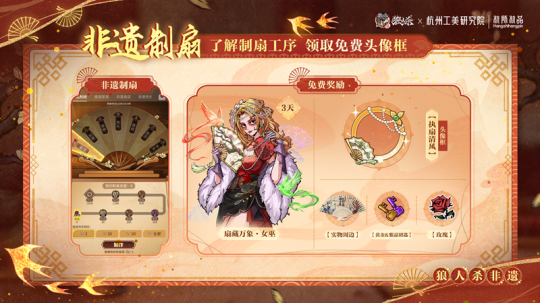 活动期间,参与任务了解非遗制扇的传统工序,从刨边、刮磨、接梢再到挫头、裁扇、刷漆、齐头,每一步都独具匠心。完成制扇挑战即可获得“执扇清风”限定头像框,还有限时联动皮肤、实物周边、游戏道具奖励等你来拿!