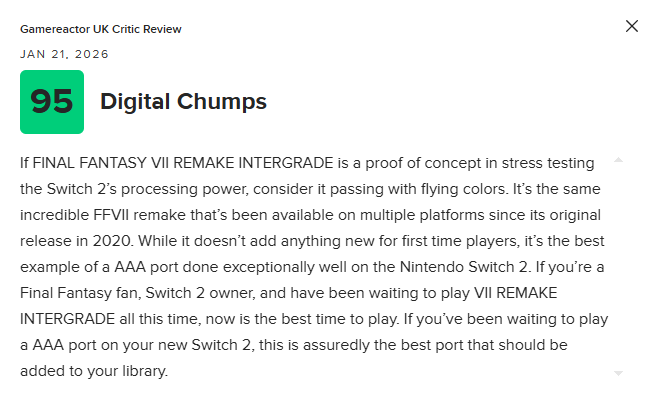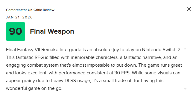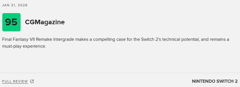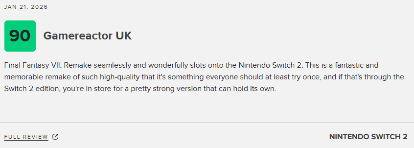 《最终幻想7:重制版》现已登陆Switch 2和Xbox Series X/S平台,本作NS2版媒体均分也已解禁。截至目前,《最终幻想7:重制版》NS2版媒体均分为89分,与PS5版均分持平,共收录33家媒体。