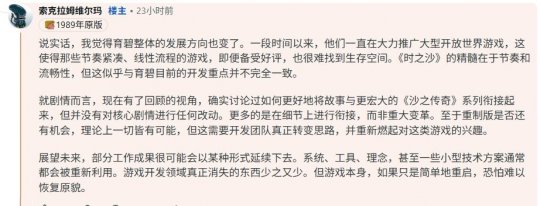 就在育碧宣布取消游戏后不久,《时之砂》重制版的开发人员在Reddit上举行了一场问答会。在回答一位粉丝关于项目被砍原因的问题时,开发人员是这样说的:"长期以来,一直有一种强烈的趋势,那就是制作大规模的开放世界游戏,这让寻求更严谨的线性游戏的新机会变得更加困难,即使这类游戏同样非常受欢迎"。而育碧昨日的新闻稿也证实了这一说法,他们的新运营模式即专注于开放世界游戏和游戏即服务模型。