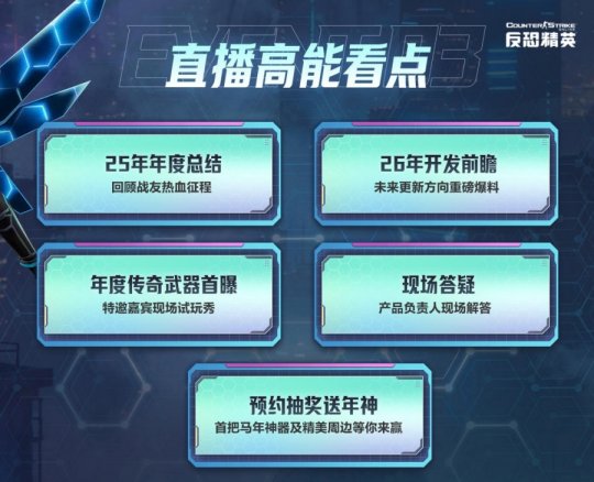 《反恐精英Online》陪伴战友们一同度过了非常精彩的2025年。不仅有勾起大家青春回忆的重铸生化英雄模式上线,也带来了灾变禁区这样可持续养成、不断变强的全新玩法。去年还陆续上线了武器改造、委托任务等全新系统。相信战友们一定非常好奇,2026年《反恐精英Online》又将会带给大家哪些新的惊喜呢?不用着急!本次前瞻直播不仅将为大家带来2026年开发团队的更新方向,同时《反恐精英Online》产品负责人陆禕先生还会亲临现场解答战友们所关心的各种游戏问题哦!让我们一同期待吧!