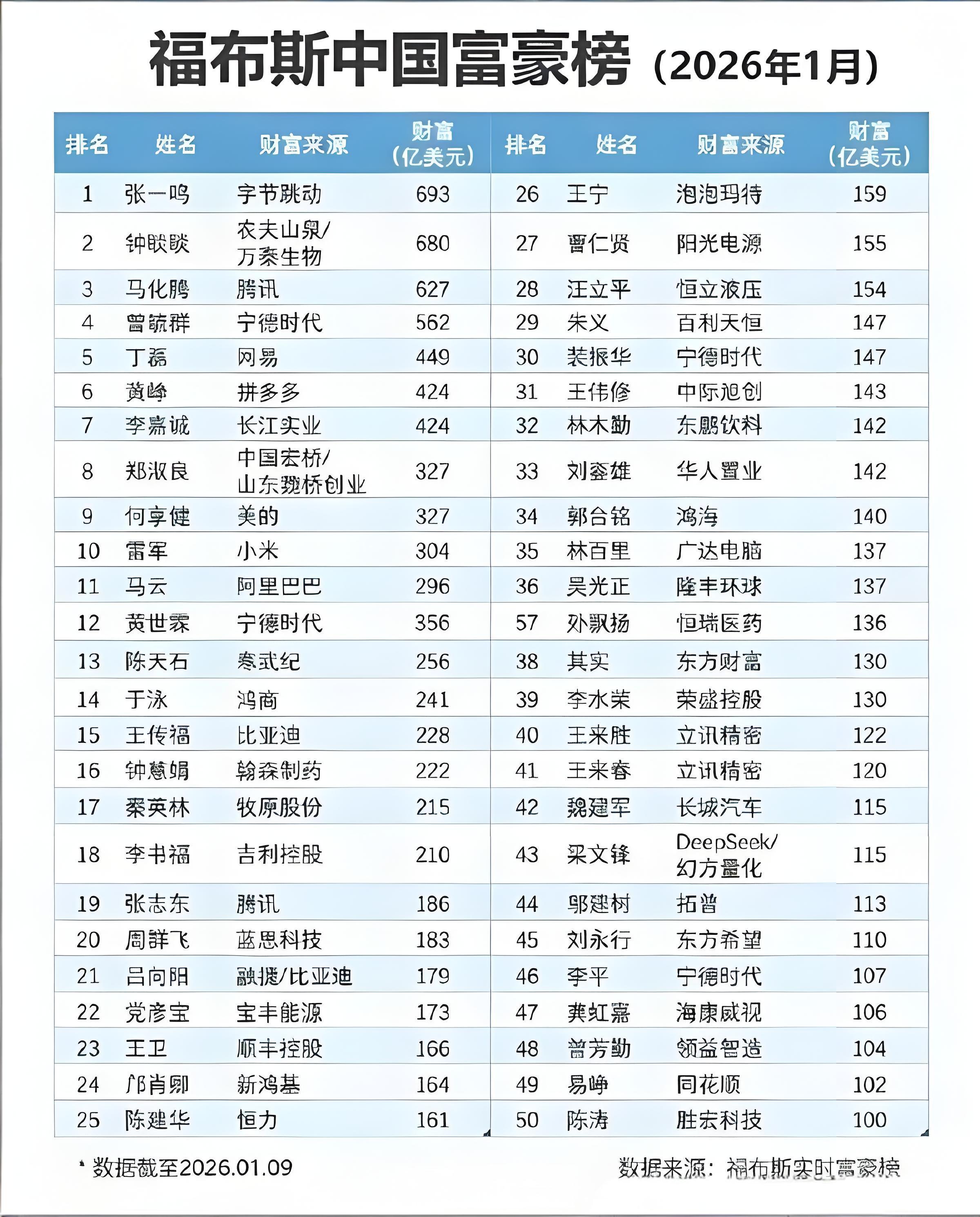 近日,福布斯中国富豪榜进行了更新(截至2026年1月份),前十名中除了稳居前三名的张一鸣、钟睒睒、马化腾外,大家熟悉的还有曾毓群、丁磊、李嘉诚等。值得一提的是,雷军也进了前十名,其拥有的财富为304亿美元,而马云排在其后面,财富为296亿美元。比亚迪的王传福(228亿美元)、顺丰王卫(166亿美元)、泡泡玛特王宁(159亿美元)、长城汽车魏建军(115亿美元)和DeepSeek梁文峰(115亿美元)分别排名第15名、23名、26名、42名和43名。