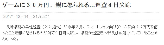 想来各位玩家都有瞒着父母在游戏中偷偷充钱的经历,如果哪天自己氪金的事情被父母发现了你会怎么办?有一位日本警察,因为游戏氪金30多万日元被父母发现,害怕受到责骂的他选择了离家出走。是的,你没看错,一位警察怕被家长骂所以离家出走... 这位巡警年仅20岁,在日本长崎县就职,日常沉迷于手游。在这次事件之前曾因氪金十几万日元被父母训斥过,还做出了今后不玩手游的约定,但实际上他沉迷其中无法自拔。 这次事发的原因是他的信用卡账单被直接寄到家中,被母亲发现其中的30万元手游消费。在母亲向他打电话询问后,他因为害怕回家被骂便选择了逃避,随便编了个理由离岗早退,随即出走并消失了四天。 因为父母四天找不到他,只好选择报警,警方出了失踪者名单,最终他在驾车途中被山口县的警察发现。经过询问得知,这位年轻的巡警游戏氪金所用的钱来源合法,也有经济能力支持他在手游上的消费,生活工作上也没有其他问题。之所以选择离家出走,只是因为不想被父母责骂。幸运的是最终他没有丢掉工作,只是受到了一些处分。 小伙伴们,你们有游戏氪金被父母发现的经历吗? 编辑:辰辰