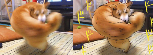 例如,这只柴犬追玩自己尾巴的瞬间被拍了下来,由于照片模糊看着又有趣,激发了热心网游的创作脑洞。为这只柴犬配上了一只兄贵肌肉手,看着十分有趣。