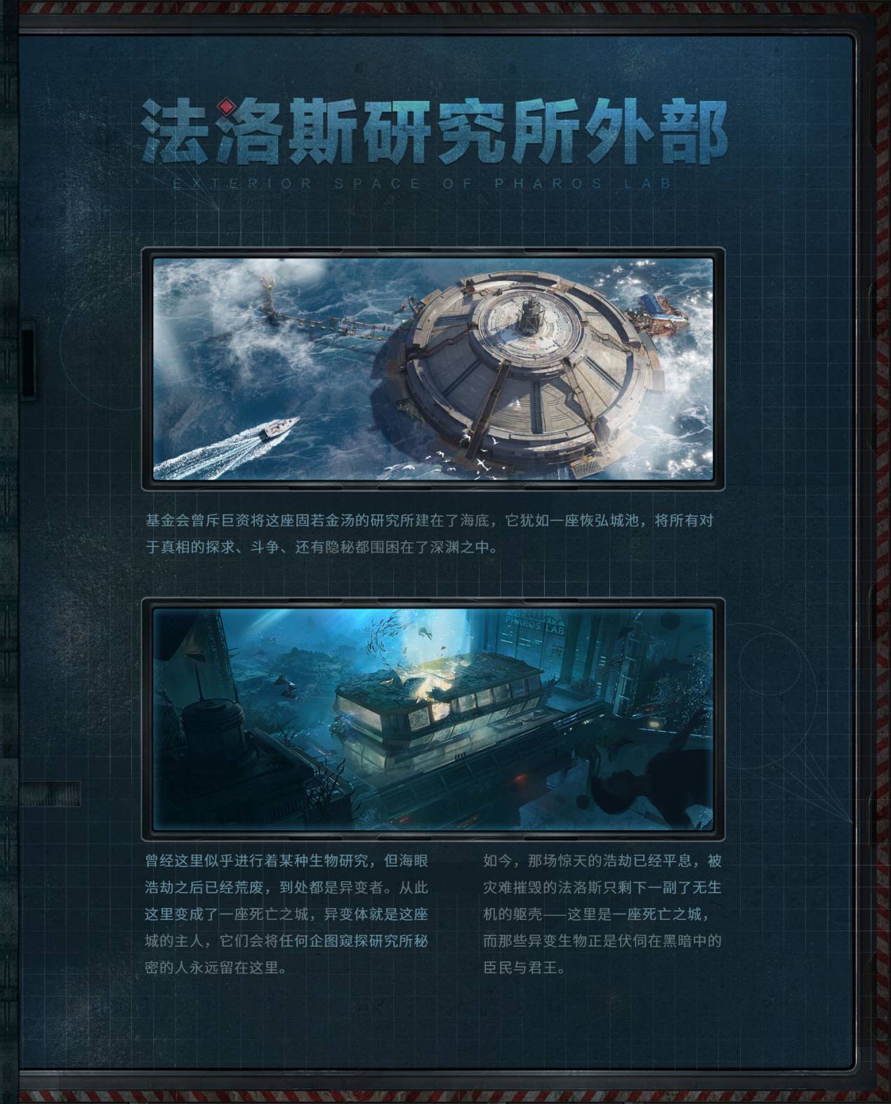 参与了首次测试的玩家,都会见过法洛斯研究所的一角,但那都是在海底下的。而这次解禁的档案中给我们展现了其外部景象,俯瞰如一座海上堡垒,然而从资料内容可以看出,这气势恢宏的外表之下,貌似隐藏了一些见不得光的东西。结合《代号:ATLAS》在官网放出的游戏概念视频可以得知,法洛斯研究所如今破落的模样全拜那场海洋浩劫所赐。但是这些异变体又为什么像守护着某种东西一样聚集在这研究所之内呢?也许一切的谜底都要玩家亲自操控角色,深入法洛斯研究所之中揭开。