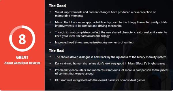《质量效应:传奇版》已经发售一周多,近日外媒GameSpot公布了对本作的评测,并给出8分好评。评测者觉得,《质量效应:传奇版》是对原版的一次改进,使得《质量效应1》相比于原版更能让玩家享受这款游戏。