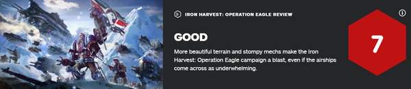 凭借着与本体同样出色的视觉设计,《钢铁收割》DLC“飞鹰行动”为这款柴油朋克RTS又添上了可喜的新内容。全新加入的乌索尼亚势力看起来很棒、玩起来也很有趣——尽管其标志性的特色飞艇在行动中没什么劲。真正让本款DLC脱颖而出的还是新加入的剧情战役,开发者将有趣而风格经典的RTS任务穿插进了一段迷人、还有大型作战机器人的人类历史中。