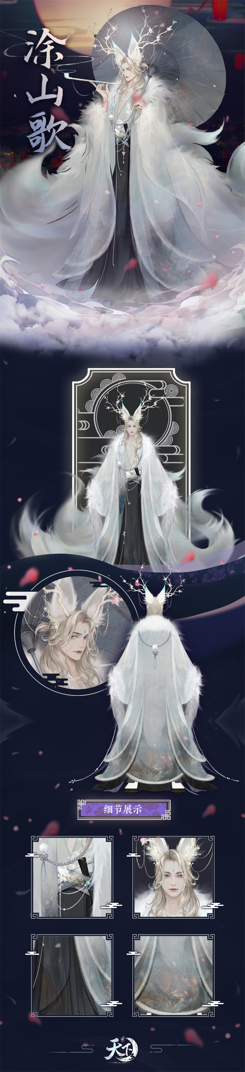男款的【涂山歌】则以素雅白和沉稳黑的搭配为主,飘逸中还多了几分温润的公子气息,华丽的毛裘将角色包裹其中,衣摆处以丝线织就繁复的花纹,左手撑伞,气质出尘,仿佛遗世独立的仙人。