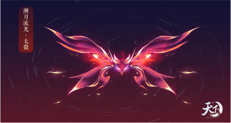 【溯月流光·太微】以大气稳健的红色为主色调。太微垣,同天市垣、紫微垣一样,为三垣之一。红色的翅膀整体更显沉稳,既有火焰般的奔放,又有枫叶的唯美,更有与热血媲美的激情。