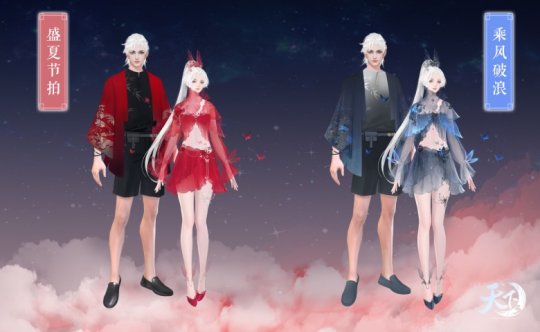 自古红蓝出cp,本次《天下3》的新时装也出了两个特别的时装:燃烧的火焰【盛夏节拍】和畅游大海的【乘风破浪】。象征夏日热浪的【盛夏节拍】整体以热情的红色为主色,用小红花作为点缀,娇俏艳丽。男款则在细节上点缀金色,低调且奢华。【乘风破浪】则以深蓝为主色调,女装黑纱隐约透着神秘感,肩膀和袖口处的蓝色更像闪烁在天空的繁星,亮眼夺目,男装的袖口则和女装带有同款星光。