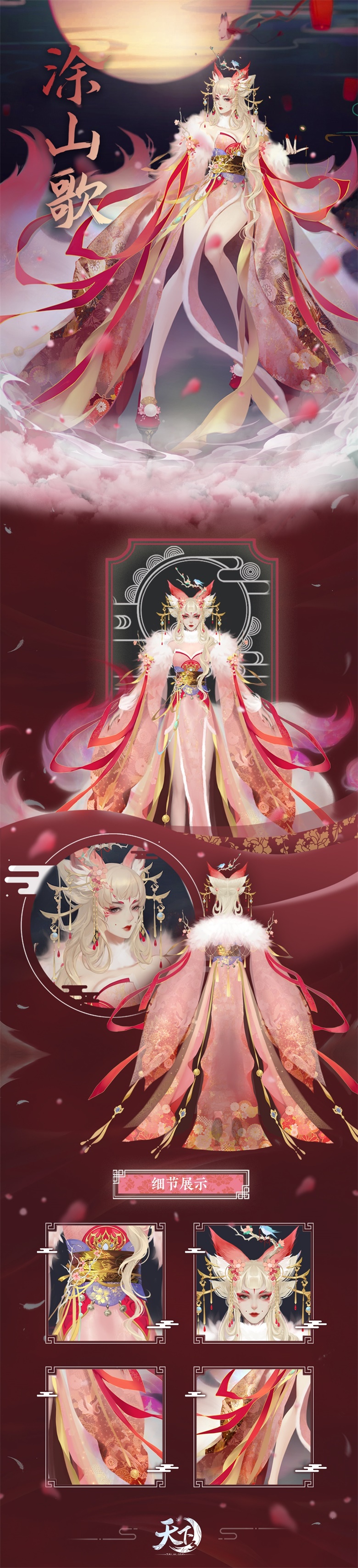 新时装【涂山歌】倾城降临,一展狐仙绝美风姿。女款的【涂山歌】以柔美娇媚的粉色为主色调,薄纱之下美人香肩若隐若现,鎏金色的束腰勾勒出纤细的腰肢,更显婀娜多姿。束腰处的小巧铃铛随身摆动发出清脆的响声,身后的狐尾慵懒地垂下。倾城之姿,媚绝大荒。