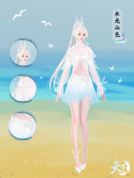 在六月这个戏水的绝佳时节,《天下3》还推出凉爽清新的【水光山色】新时装。【水光山色】女款时装以半透明的白纱为主材质,色调以温柔的白和浪漫的浅蓝为主,充满了夏日的清爽气息。银白色的长发束起盘成俏皮的蝶翼状,透明的头饰上点缀着可爱的小花,领口处的波浪形剪裁新颖大胆,宛如蝉翼的袖子在袖口处收紧形成一个极具少女感的泡泡袖和蝴蝶结,肩膀处还装点着俏丽的小花。