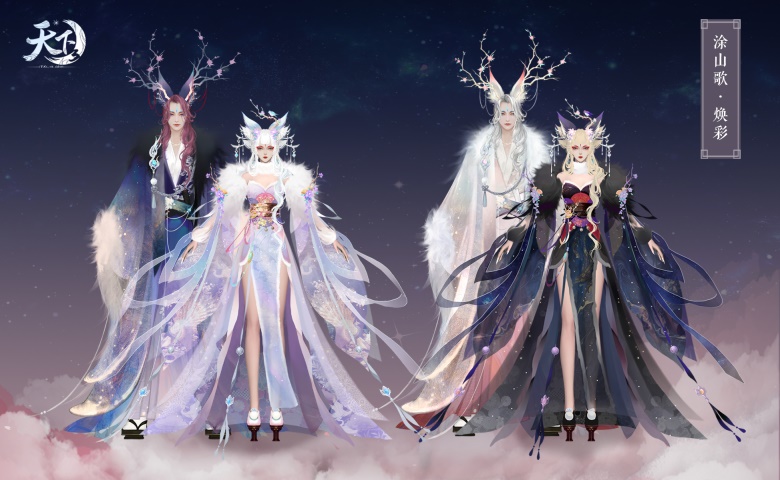 【涂山歌】新时装如此绝美,两款伴生的焕彩更是锦上添花,给人一种耳目一新的感觉。两款焕彩一深一浅,浅色的焕彩款以淡紫色和浅橙色为主,整体上更梦幻。而深色的焕彩款以高贵的黑色和深邃的星空紫为主色调,华丽大气,两者相映得彰。