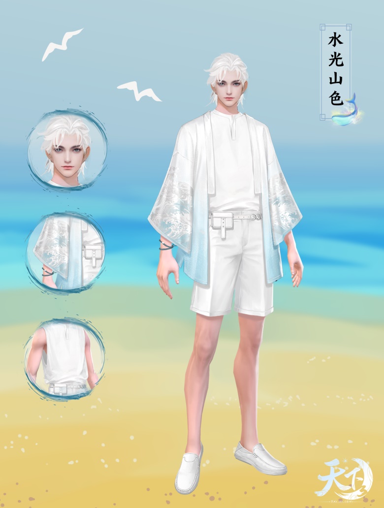 男款的【水光山色】同样以优雅白和淡蓝色为主,一头时尚清爽的白色短发,内搭简洁的白色背心,外穿一个渐变的宽松外套,由领口至衣摆渐渐呈现出海水般的蓝色,海浪的纹饰从肩膀延伸至袖口。下身是白色的短裤,腰上还系着一个精致的白色腰包,细节之处更显时装品质。