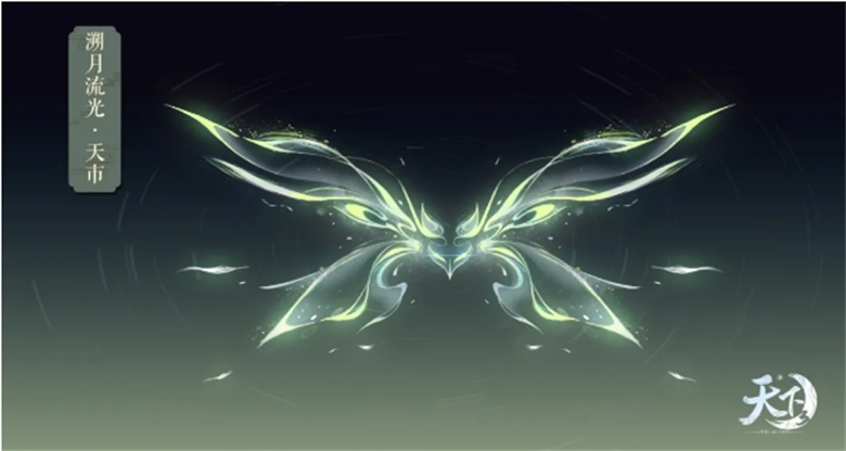 一星如月看多时,一个充满仙气的翅膀更是让人久久不愿移开目光。本次上架的三对翅膀均以星辰命名,寓意“击空明兮溯流光”。下面这件【溯月流光·天市】翅膀,以青色的星空为设计灵感,象征着希望和生机,将天上市集的热闹和玄妙融入翅膀和光芒中,充满了美好的寓意。