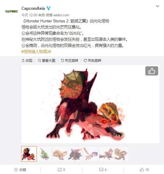 卡普空官方微博@CapcomAsia今日发布了《怪物猎人物语2:破灭之翼》的新怪物图鉴。同时,他们还介绍了本作出现的新概念“凶光化”——一种让怪物发出光芒且狂暴化的状态,这种异常现象被命名为“凶光化”。凶光化的怪物会双眼放出红光,力量大幅上升,身体周围也会泛起红色的光芒。
