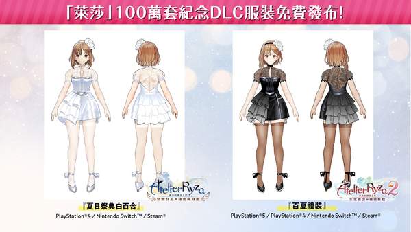 光荣特库摩在今年的4月初公布了《莱莎的炼金工房》系列全球累积出货量突破100万套的好消息,并称将会给玩家们免费发放纪念DLC服装以表感谢。随着时间的推移,庆《莱莎》系列百万销量纪念DLC上线了。这个免费的DLC包含了《莱莎的炼金工房》及《莱莎的炼金工房2》的莱莎专用服装各1套,各位玩家快去领取吧!