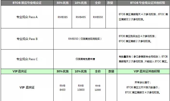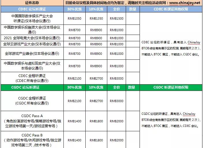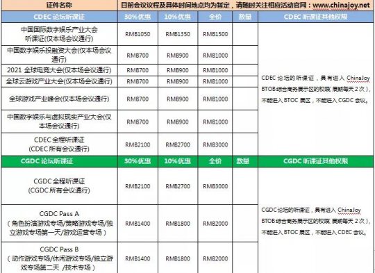 与BTOC展区不同,参加BTOB综合商务洽谈区或各种同期会议均需购买或申请相应的专业观众证和听课证。为了回馈早期购买证件的业内各界人士,ChinaJoy主办方汉威公司与往年一样,特别为相关证件的购买设置了不同时段的优惠期,具体活动时间及证件优惠幅度如下(以下优惠期时间以付款时间为准):