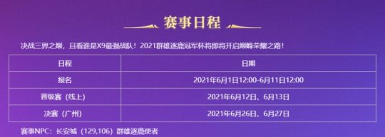 ¡¡¡¡Ä¿Ç°£¬“ȺÐÛÖð¹¹Ú¾ü±”µÄ±¨Ãû»î¶¯ÒѾÕýʽ¿ªÆô¡£±¨ÃûÆÚ¼ä£¬³É¹¦ÔÚÈ¥ÄêȺÐÛÖð¹±ÈÈüÖеÇÉÏ“ÈÙÓþµîÌÔµÄËùÓÐÕ½¶Ó¶Ó³¤¶¼¿ÉÒÔǰÍù³¤°²³Ç£¨129,106£©£¬Í¨¹ý“ȺÐÛÖð¹ʹÕß”±¨Ãû²ÎÓë±¾´Î±ÈÈü¡£ÔÚ±¨Ãû¹ý³ÌÖУ¬ÐèÒªÖÁÉÙÓµÓÐ8Ãû²ÎÈü¶ÓÔ±£¬¶øÇÒÿ¸ö×é±ðÖ»ÓÐ8¸ö²ÎÈüÕ½¶ÓÃû¶î¡£¸ù¾Ý¸÷Ö§¶ÓÎéµÄ“2020Äê¶ÈÈÙÓþ»ý·Ö”£¬³ýÁËÈ¥ÄêÔÚȺÐÛÖð¹±ÈÈüÖлñµÃ¹Ú¾üµÄ¶ÓÎ齫ֱ½ÓÓµÓÐÒ»¸ö²ÎÈüÃû¶îÍ⣬ÆäËû¶ÓÎ齫¸ù¾Ý»ý·ÖÅÅÃûÒÀ´Î¾ö¶¨Ê£ÏµÄÃû¶î¡£