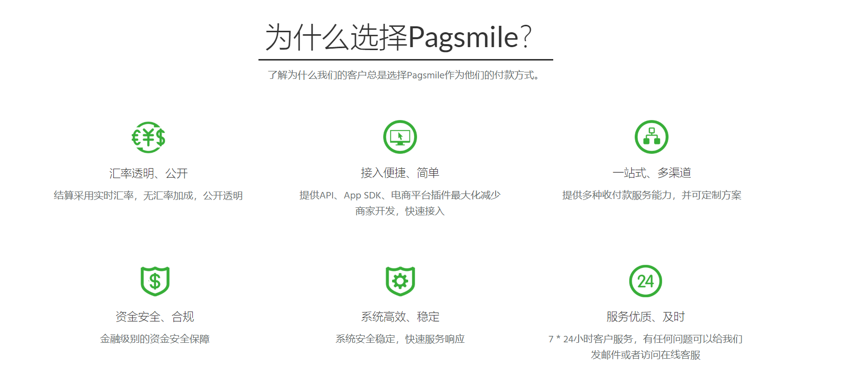 为每一个客户提供安全、便捷、高效的支付服务,帮助客户在拉美成功,是Pagsmile的发展目标!在提供支付解决方案的同时,Pagsmile深耕于每个行业在巴西及其他拉美国家的运营环境,用支付数据协助每个行业成长,包括游戏行业、电商行业、移动互联网应用、在线旅游服务等,我们的支付和运营专家团队将为客户提供全方位的支持。