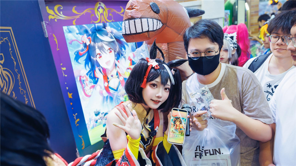 当天,菌儿、舞小喵等数位知名头部coser也在现场帮助玩家们抽卡,这可以称得上是一场超大规模的线下《闪耀!优俊少女》欧皇-非酋联欢会,现场每一次北黑卡池欧皇的诞生都会引起围观玩家的惊叹和羡慕,展台现场的气氛过于欢乐!