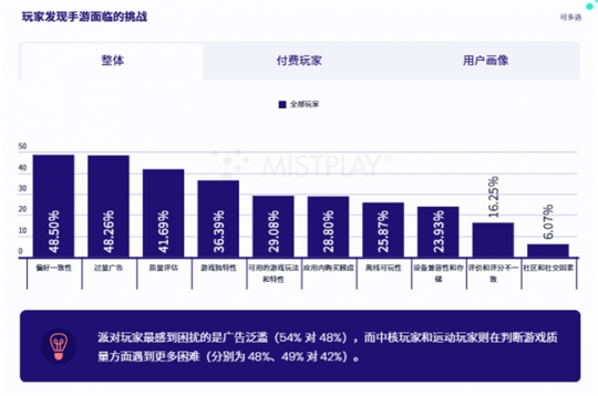而Mistplay在其《2024年手游增长报告》中曾分享,当被问及发现游戏面临的主要挑战时,49%的受访用户难以找到符合偏好的游戏,有超过48%的玩家迷失在海量的游戏广告之中,还有42%的玩家表示无法在进入游戏之前判断游戏品质。玩家们对于真实游戏信息和优秀社区平台的需求从未消减。