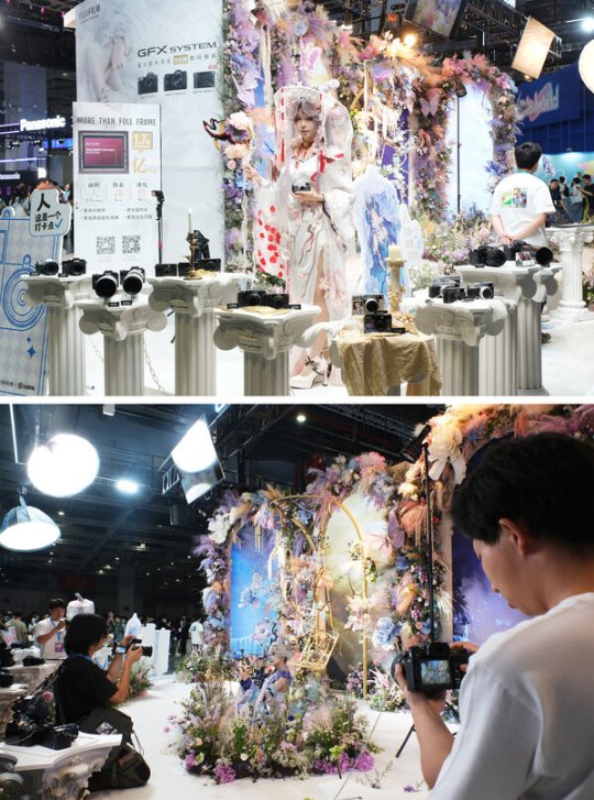 富士胶片展台也成为了摄影师与Coser"双向奔赴"的舞台。四位活跃于二次元与摄影圈的创作者——CN 富小新、天地鸿鸥、Liky与Winys,虽然来自不同创作背景,却不约而同选择了富士胶片 GFX 中画幅系统来记录那些二次元角色被精彩演绎的瞬间。