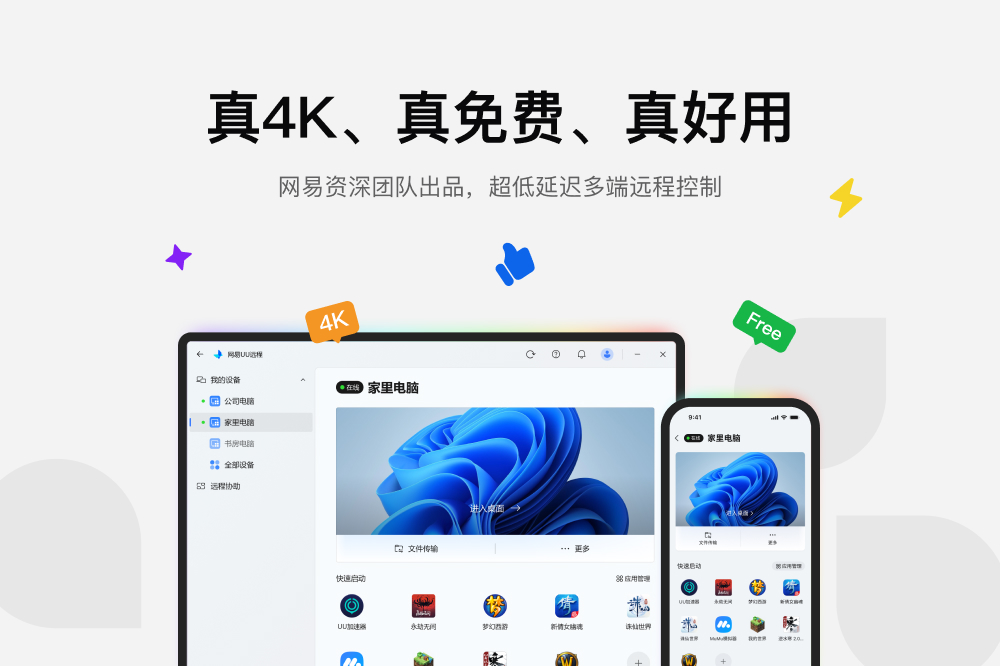 网易 UU 远程一直凭借独特技术,帮助用户随时在手机或平板上畅玩 PC 游戏,注重画质、帧率和按键操作体验。其 P2P 直连技术实现超低延迟,支持最高 4K144 帧,提供流畅体验,并完美还原端游画质。而在4.0版本中,UU远程更加聚焦远程技术与办公场景的深度融合。基础功能涵盖高清远程桌面控制、文件高速传输、跨平台设备互通等核心远控能力,实现复杂网络环境下的稳定连接,满足了远程会议、居家办公、移动协同等多元场景的灵活性需求。