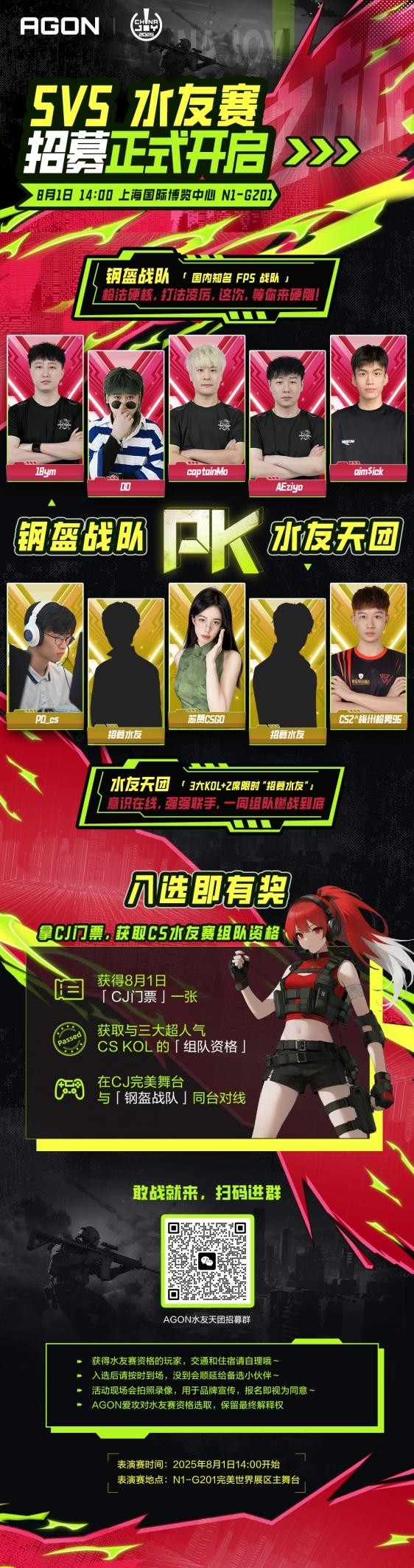 AGON爱攻面向全网所有热血CS玩家,招募2名天选之子,与3位完美世界电竞官方公会主播组队,一同对抗传奇钢盔战队(战队会有操作限制),为现场观众带来一场激情热血的水友表演赛。敢不敢在现场和“传奇钢盔”碰一碰?这可能是你离职业大神最近的一次!证明自己实力的时刻到了!