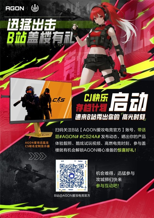 N1-G201完美世界展区现场参与“AGON爱攻迅猛出击·B站盖楼有礼”活动,关注B站【AGON爱攻电竞官方】账号,带话题#AGON#、#CS24A#发动态,晒产品体验靓照、酷炫试玩视频、高燃电竞时刻…… AGON专属线上好礼等你来拿。