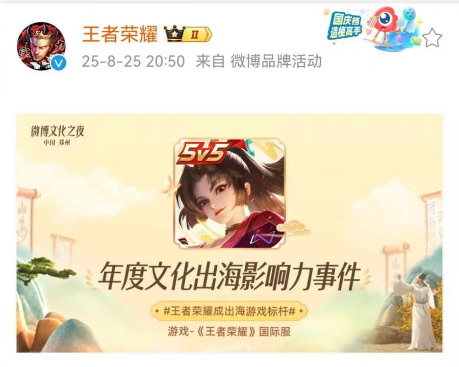 在前不久的“微博文化之夜”上,腾讯的《王者荣耀》国际版(Honor of Kings,以下简称HoK)与《哪吒2》、宇树机器人、阅文集团、《藏海传》等不同领域的文化代表共同入围“年度文化出海影响力事件”奖项,并被主办方特别称为“出海游戏标杆”,认可其在全球市场中的表现。作为数字文化出海的重要尝试之一,HoK正通过游戏载体在全球市场进行探索。其将游戏产业价值与中华文化内涵相结合的实践,成为观察中国数字IP出海路径的一个新鲜案例。