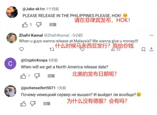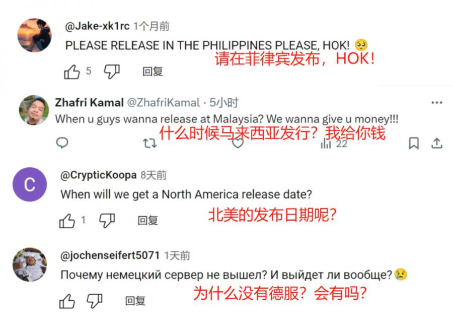 巴西的成功,如同一颗投入池塘的石子,涟漪迅速扩散至全球。经此试点, HoK在国际市场积累起了声量,海外社群中也开始出现“催开服”的声音。“什么时候来北美?”“快来菲律宾吧!”的呼声,如春笋般在各个社区不断涌现。在这个时候,HoK的全球上线成了自然而然的下一步。