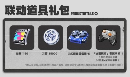 联动道具礼包包括菲林*100、丁尼*15000、正式调查员记录*5和「绝世玩家」专属手柄等联动道具。