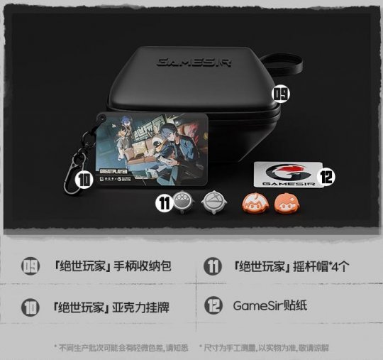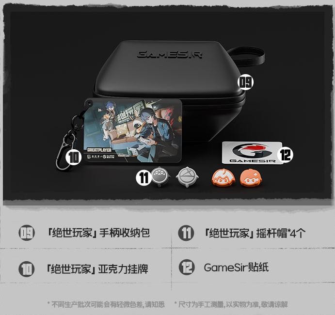 随手柄还附赠「绝世玩家」手柄收纳包、「绝世玩家」摇杆帽*4个、「绝世玩家」亚克力挂牌*1和GameSir贴纸一张。