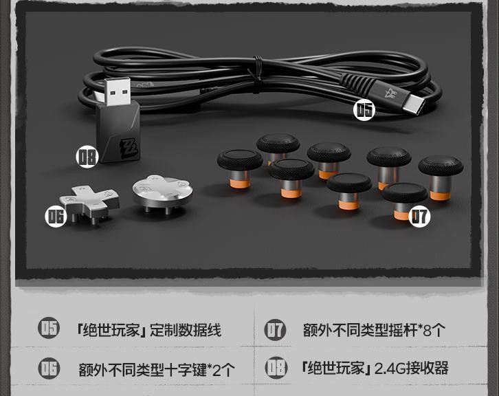 另外还有「绝世玩家」定制数据线和「绝世玩家」2.4G接收器,让玩家随意选择手柄的连接方式。
