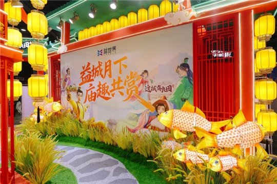 本次益世界展台以“益城月下 庙趣共赏”为主题,设计以国风为主,巧妙融合《我是大东家》的古代市井商贸元素与《这城有良田》的风雅庭院景致。让玩家既可化身东家经营酒肆,又可化身城主过上有城有田的休闲生活。从视觉到场景的全面古风沉浸,为玩家构建了一个暂离现实的东方美学空间。