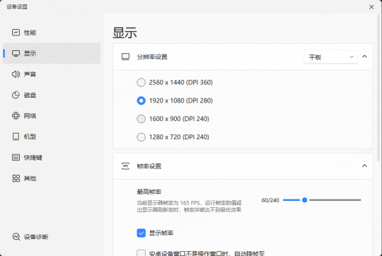 点击设备设置-显示,将分辨率调整到 1920*1080,并将帧率调整到 60 帧。