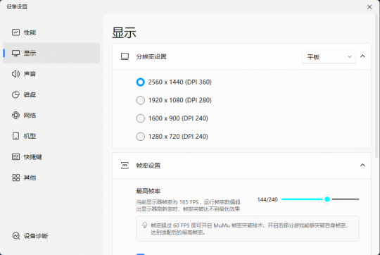 点击设备设置-显示,将分辨率调整到 2560*1440,并将帧率调整到 144 帧。