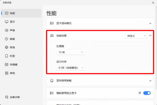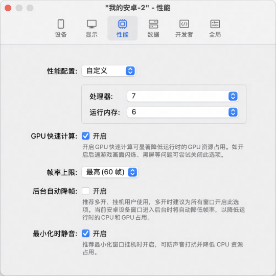 点击性能,开启 GPU 快速计算,性能设置调整为“自定义”,处理器选择最高选项,最大值建议为 8,运行内存选择最大值选项,最大值建议为 7,帧率上限选择“最高”,并勾选最小化时静音功能。
