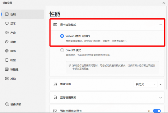 点击 MuMu安卓设备菜单-设备设置-性能,显卡渲染模式选择 Vulkan 模式,再将显存使用策略调整到自动调优,并勾选强制使用独立显卡功能。