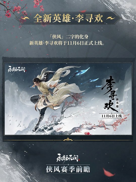 李寻欢即将登场,链剑破空而来。据官方公告,新英雄李寻欢将于11月6日正式上线,成为侠风赛季的核心亮点。