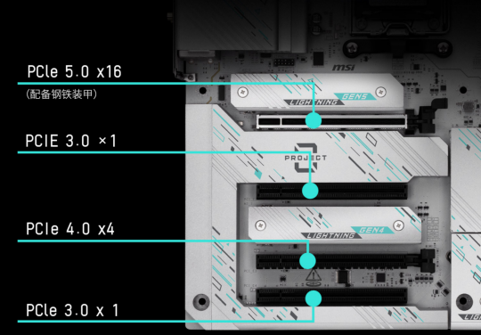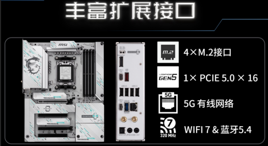 配备PCIe 5.0 x16显卡插槽、3组M.2接口(含Gen5 x4 128Gbps),并覆盖冰霜铠甲散热。网络方面搭载Wi-Fi 7与5G有线网卡,配合MSI AI网络管理器智能优化游戏流量。