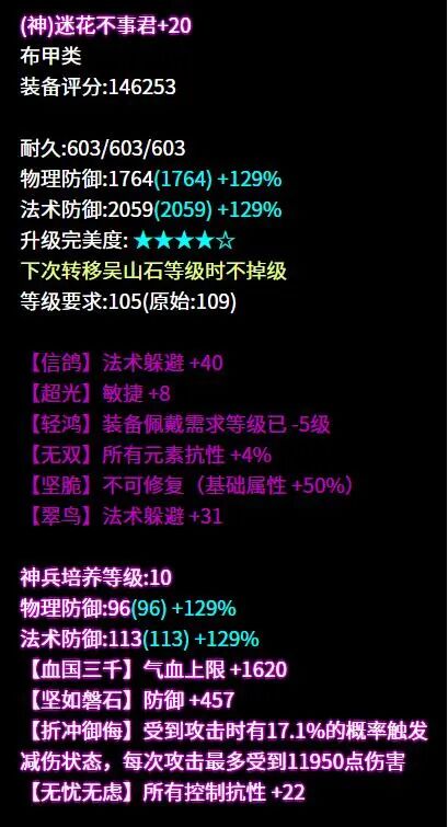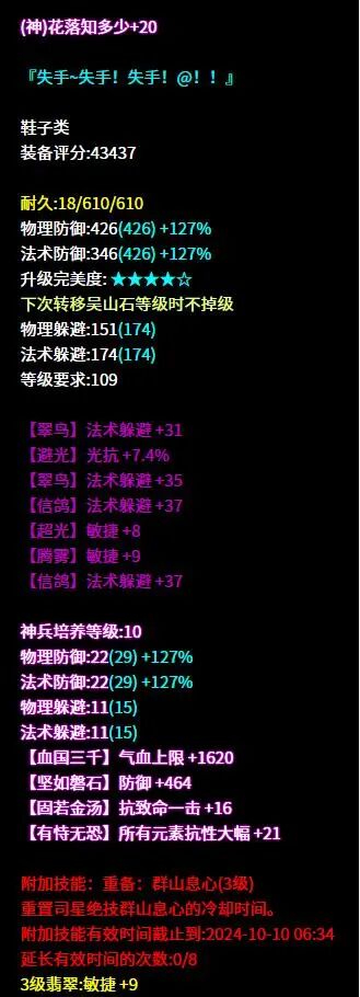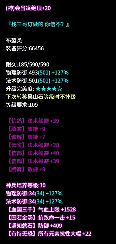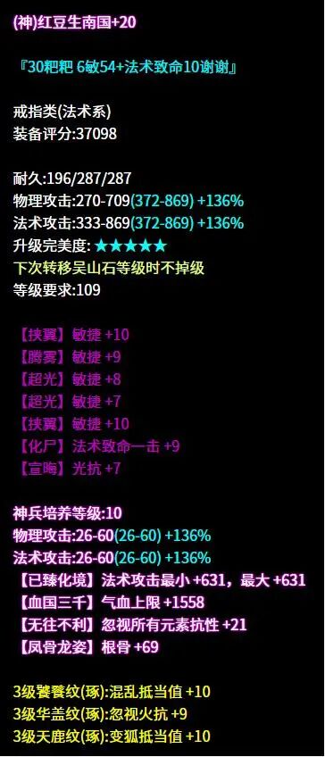 弹指而过已是十一月 天气渐冷,倩倩想起与好友紫萍许久未见 遂决定今日前去拜访 刚至逍遥观,便有哭声传来 可恶!倩的紫萍怎么一直在哭 问其原因,回于战场遇一司星 到底是何方神圣 倩倒是要去瞧上一瞧! 瞧完了,紫萍啊 咱们还是一起哭吧 昵称:じ☆星魂ve 职业:司星 等级:109级 区服:[独步天下] 帮会:々龙行天下々 (以下数据来源于更新于梦岛2025.11.4) 六绝双50+最大+法术致命 +司星之魂+医师职伤 鱼哭了水知道 我被大大打哭了谁又能知道呢 好啦现在大家都知道了 七绝三敏+四法躲的布盔 敏捷词条进一步提高躲避 同是法系人,相煎何太急 在律师来之前 我方法系是不会多说一句的 六绝轻鸿+不修+双法躲 +敏捷+所有元素抗比 每个词条都发挥了它应有的作用 废词条? 少侠的字典不存在这几个字 六绝三敏+法术致命+繁花落烬5 面对这样的项链 铁打的倩也会被伤害到 仇人看到我过得这么惨 也都该消气了 逆天五敏+气血+抗法术致命 我曾经哭过笑过 最后反复问自己 为什么大大打我永远不会失手 这是什么悲伤的故事 逆天五法躲的腰带 最近认识两个法系朋友 他们总是闷闷不乐愁眉不展 倩决定为他们解忧 于是挺身而出找上大大 哈哈,这下我和他们一起闷闷不乐啦 七绝四法躲+双敏的鞋子 刻字很符合这双鞋子的调性 反复失手也无需难过 等和大大交手多了 就能够习惯啦 七绝五敏+法术命中+气血 让我们愉快地结束这次对战吧 主要是倩单方面投降 大大单方面碾压 七绝五敏+法术致命 队友,我回来了 我被打得鼻青脸肿的回来了 难道就没有一个人 想要为倩讨回公道吗 为什么你们一个个都避开我的目光 逆天五敏+法术致命的手镯 太强了也会有苦恼 比如这位少侠 已经很久没有体会过那种 打得不可开交的感觉了吧 六绝五敏+法术致命的手镯 吾乃路过,无意开战 少侠你继续盘你的手镯吧 我会不发出一丝声音离开的 六绝轻鸿+双法术致命+医师职伤 紫萍,紫萍 我懂你的悲伤与痛苦 不如这样吧 我们一起手拉手举白旗 固定四法躲的护心镜 洗出整齐六绝六法躲 乾坤袋,这我就要批评你了 大大已经够强了 你怎么还要给他锦上添花 你有考虑过我的感受吗! 这位109级的司星大大走的是高敏法躲流。武器双50最大技能2克医双手灯烛,搭配同样带克医词条的挂饰,医师看了直呼救命,高敏首饰加强命中,面对敌人几乎没有失手这一说,有效输出唰唰唰地打过去。 防具上整体走法躲流,部分敏捷词条提高躲避,不修布甲加强基础属性与气血,高法躲令大大面对法系的一些伤害也能游刃有余,操作空间更大,在109级里面绝对是让对手头疼的存在。 |