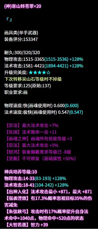 天水清相入,秋冬气始交 秋冬之际,三界一派独特景致 想到即将来临的初雪 倩倩兴致勃勃 决定喊上三五好友到时一同围炉煮雪 最好还邀请一位画师 届时记录美好时光 于是小蝶向倩推荐一侠 可是小蝶,我说的是画画的画 不是把我暴揍的画啊 昵称:小羊不吃饭 职业:画魂 等级:129级 区服:[兰若词] 帮会:゛千城墨白ぅ (以下数据来源于更新于梦岛2025.11.24) 六绝轻鸿+不修+双最大+画魂之神 +法术致命的137单手画具 石之灵·悟则圣加强攻击与命中 再也不惹学画画的了 怎么打起倩来 比神机营那堆家伙还狠 固定四敏的布盔 洗出六绝六敏 对手是怎样的感受先不提 但是强迫症患者有福了 唰一眼看下来全是敏捷 七绝轻鸿+神赐+三物躲 +气血的137布甲 ?天冷多穿衣,但少侠不必 你这一件布甲,可抵万衣 降温我没有心寒 看见对手是穿着这件衣服的大大 倩心寒了 六绝四敏+智力+庄周梦蝶4 下辈子让我当蝴蝶吧 我就停在大大肩上 看着大大左挥一下,右打一下 然后周围躺倒一大片 七绝轻鸿+四格挡 +物防+精力的137护腕 虽然倩的抗压能力为0 但少侠是我的队友 就很好的填补了这份空缺 六绝神赐+三敏+法术命中+混抗 提高基础属性后更加强大 队友看了微笑,敌人看了落泪 倩倩看了准备来当挂件 七绝五物躲+混抗的腰带 物理系,浅防一手 魅者,也浅防一手 优秀的画魂就是如此 努力护好小命面面俱到 七绝五敏的鞋子登场 命中加加加躲避加加加 对手不语并持续保持沉默 只一味地在倩倩圈发布求助帖 七绝三敏+三法术致命 听说有人在找这个戒指的主人? 本人来啦!我不是这个主人 我想来就来,想走就走 说早了,暂时走不了了 因为被打成残血了 逆天三法术致命+双法术命中 +双敏+气血的戒指 姥姥让我提前写明年计划书 我接下来的计划 就是和大大成为队友 一切就迎刃而解了 逆天四敏+双法术致命 我是个急性子 在关宁遇见大大的第一秒 就想下机了 这种症状怎么破 六绝四敏+双法术致命 喜欢一个侠是藏不住的 喜欢一个装备也是同样的道理 就像面对这戒指 我捂住嘴,爱意也会从眼睛流露出来 六绝双法术致命+智力+医师职伤 我为紫萍一大哭! 前面她还乐滋滋和我一起 看少侠的物躲词条呢 结果发现冲医师来的 六绝四物躲的护心镜 今天法躲退场,物躲登场 也没有什么别的原因 是时候让物理系也头疼一下了 这位129级的画魂少侠走的是高敏物躲流。武器方面轻鸿不修双最大技能3的137单手画具,搭配庄周梦蝶4高敏项链与克医挂饰,针对性满满还能打出超高伤害,高敏首饰兼顾致命,打人完美诠释稳准狠。 防具上轻鸿神赐137布甲十分给力,神赐手套同样提高基础双防,可以堆出很亮眼的双防数据,整体走物躲,兼顾一些混抗,敏捷词条进一步提高躲避,面对物理系时输出空间更大,若是遇见难缠的法系也可切一手法躲装轻松应对,队伍里的完美画魂就是大大! |