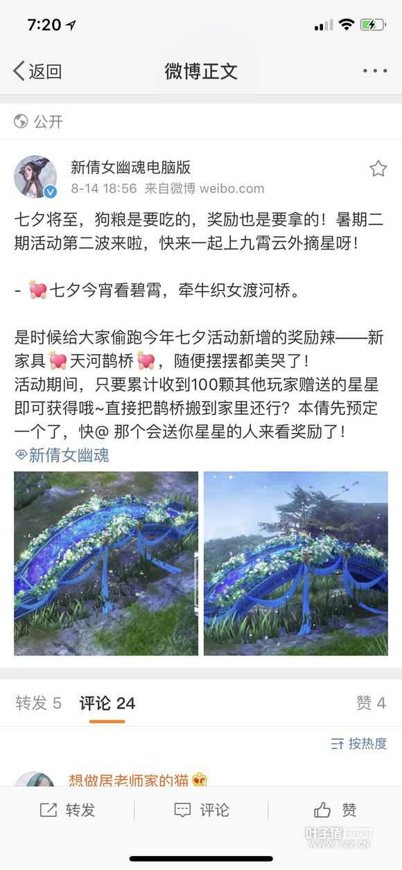 倩女幽魂中家园有许多的装饰物,但是看久了多少有些腻味了,现在七夕推出了全新的家园装饰家具天河鹊桥。爱装修的妹子们千万不要放过了!获取方式很简单,不过需要花费一些元宝,受到100颗别的玩家赠送的星星就可以了!不仅可以虐狗顺便还能炫富!